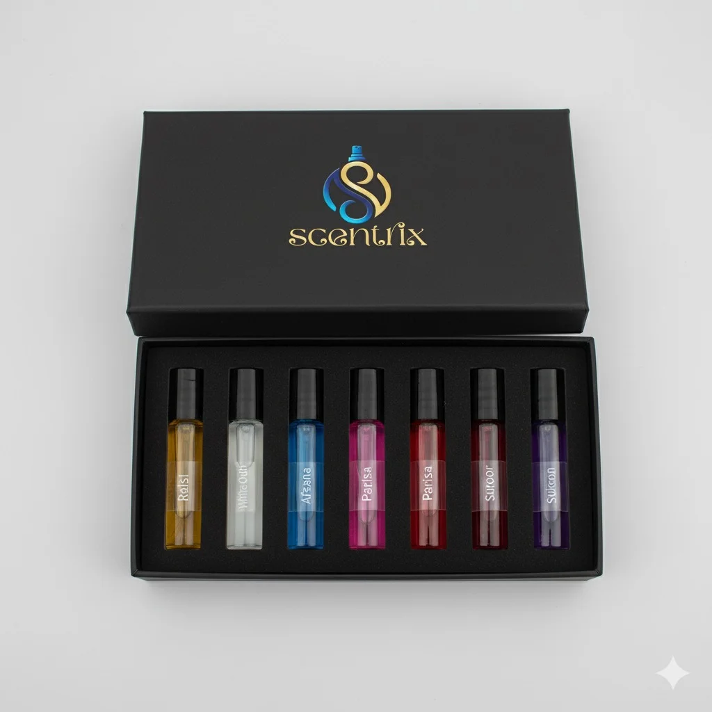 Experience the complete Scentrix collection with our exclusive Tester Kit featuring six signature fragrances: White Oudh, Raisi, Afsana, Parisa, Suroor, Sukoon.